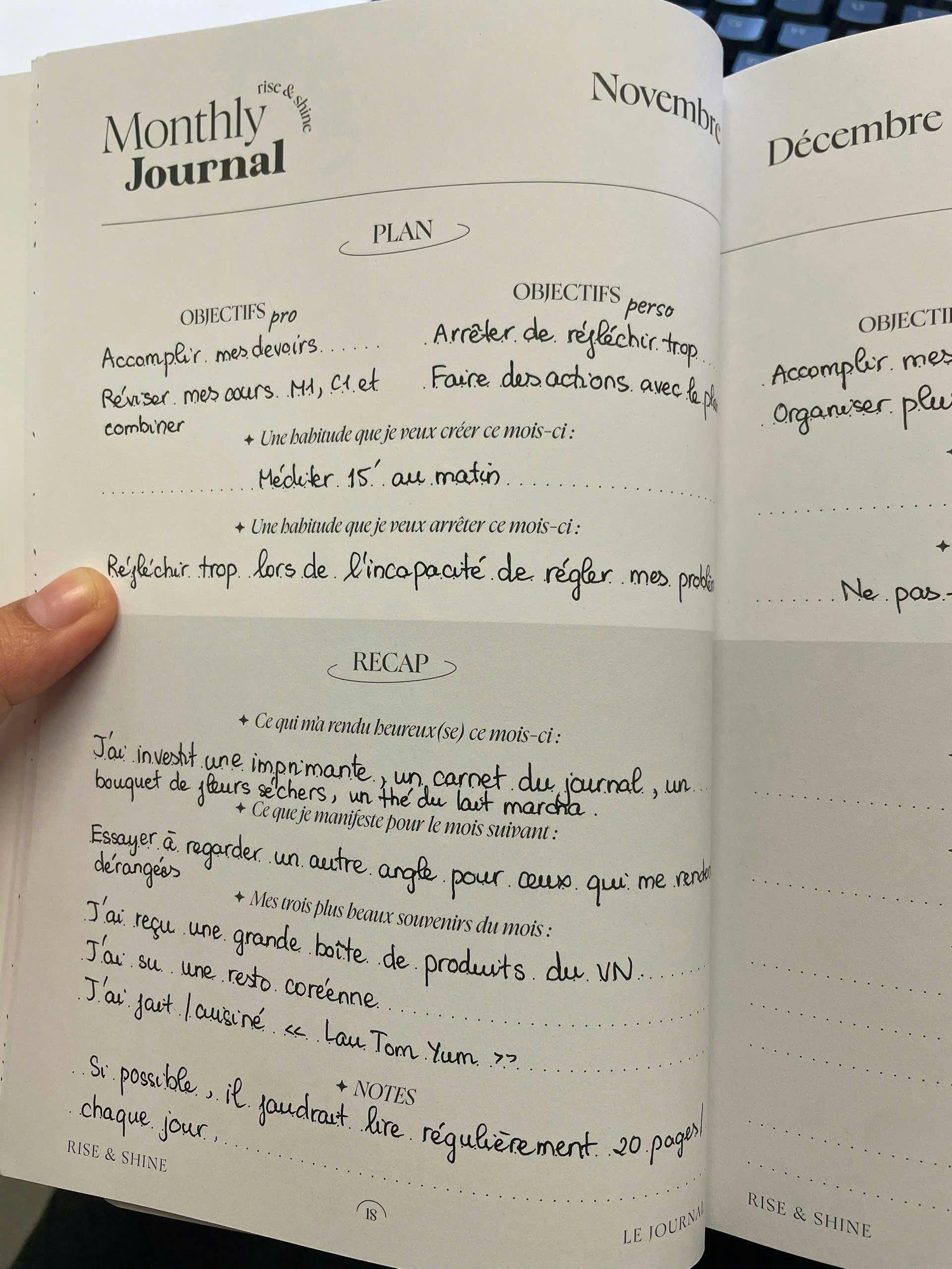 J’ai toujours tenu un journal, mais je n’arrivais pas à écrire tous les jours. Ce journal avec quelques questions à répondre matin et soir me permet de commencer et de terminer mes journées en douceur. Merci